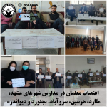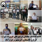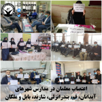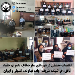 ارگان خبری مجموعه فعالان حقوق بشر در ایران، امروز یکشنبه ۱۰ بهمن ۱۴۰۰، شماری از معلمان شاغل در مدارس شهرهای ساوجبلاغ، یاسوج، جلفا، بافق، فراشبند، شریف آباد، قهاوند، گلبهار، ایوان، بانه، مرودشت، ثلاث باباجانی، لردگان، روانسر، اهواز، پاکدشت، زنجان، شیروان، شهریار، بیدستان، لامرد، کامفیروز، داراب، زرقان، معمولان، کازرون، اسلام آباد غرب، فیروزه، شیراز، کرمان، لاهیجان، خرمشهر، خرم آباد، الیگودرز، کامیاران، شهرضا، زرین شهر، سده لنجان، شهرکرد، آبدانان، قم، بندرانزلی، شازند، بابل، ملکان، مشهد، ملارد، هرسین، سروآباد، بجنورد، دیواندرە، مریانج، آبیک، تفت، باغملک، نجف آباد، بوکان، اردبیل، صالح آباد، تهران، تاکستان، بهمئی، مریوان، ملایر، قزوین، شازند، قشم، سقز، نیشابور، کلاچای، همدان، تبریز، دهگلان، درودزن، یزد، فیروزآباد، خرامه، خمینیشهر، گل تپه، ممسنی، ملایر، سردرود، شاهین شهر، اسدآباد، کرج، مشهد، بیجار، شوشتر، مهریز، جوانرود، کرمانشاه، اصفهان، فولاد شهر، چاروسا، زیویه، در محل کار خود دست به اعتصاب زده و از ادامه فعالیتشان خودداری کردند.