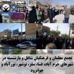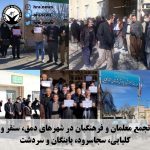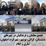 امروز دوشنبه ۱۱ بهمن ماه، به دنبال فراخوان شورای هماهنگی تشکلهای صنفی فرهنگیان ایران، معلمان و فرهنگیان شاغل و بازنشسته در شهرهای مختلف کشور از جمله میاندواب، خلخال، قصر شیرین، مهدی شهر، لردگان، اندیمشک، ابرکوه، چالوس، لنگرود، دمق، سنقر و کلیایی، سجاسرود، باینگان، سردشت، مشهد، ثلاث باباجانی، مرند، بابل، نکا، کوهدشت، آمل، تاکستان، کرج، سنندج، هرسین، گچساران، گرگان، پلدختر، گیلان غرب، ملایر، شبانکاره، نجف آباد، دهدشت، اردبیل، قم، دشتستان، گراش، دیواندره، زرین شهر، قزوین، بانه بوشهر، چاروسا، قلعه رئیسی، شهرکرد، اصفهان، ساری، ایلام، دلفان، بیجار، لامرد، رشت، رومشکان، بجنورد، اشتهارد، بافق، سمیرم، اراک، الیگودرز، کازرون، ایذه، لنده، سی سخت، بروجرد، باغبهادران، یاسوج، زنجان، داراب، شوش دانیال، بهشهر، شهرضا، آبدانان، ارسنجان، شوشتر، چادگان، اهواز، خرم آباد، فسا، نوشهر، نورآباد، سقز، جوانرود، شیراز، کرمانشاه، ارومیه، شاهین شهر، خرمشهر، اقلید، مریوان، همدان، یزد و تبریز در مقابل ساختمان اداره آموزش و پرورش شهرهای خود و معلمان تهران در مقابل ساختمان مجلس شورای اسلامی، در اعتراض به عدم رسیدگی به مطالباتشان دست به تجمعات اعتراضی زدند. در جریان تجمع فرهنگیان تهران، شیراز و مریوان دستکم ۹ شهروند توسط ماموران انتظامی بازداشت شده که از میان آنها ۶ تن ساعاتی بعد آزاد شدند.