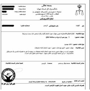 کاویان کریمی، شهروند ساکن تهران روز دوشنبه ۹ خردادماه طی ابلاغیه ای به شعبه ۱ بازپرسی دادسرای اوین احضار شد. از آقای کریمی خواسته شده تا ظرف مدت ۵ روز از زمان درج احضاریه در سامانه خدمات الکترونیک قضایی در این شعبه حاضر شود.
