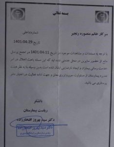 سید بهروز افتخارزاده، در نامهای که ۲۹ تیرماه ابلاغ کرده است، منصوره رنجبر را از مسئولیت سوپروایزری معلق کرده و او را در اختیار دفتر پرستاری قرار داده است.